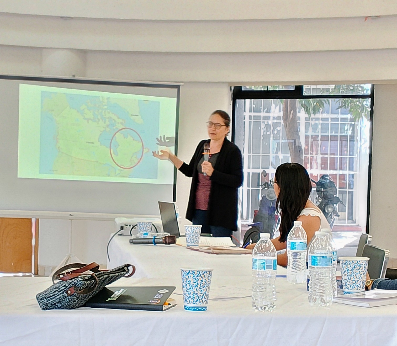 En esta mesa participaron la investigadora canadiense junto a la Dra. Rosa Yáñez Rosales, la Mtra. Ximena Lemus Villafuerte y la Mtra. Brenda Castañeda (UACI).